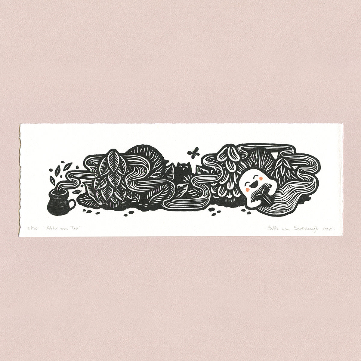 This woodcut is printed with artist quality oil based ink, the soft orange details are painted by hand with acrylic ink.