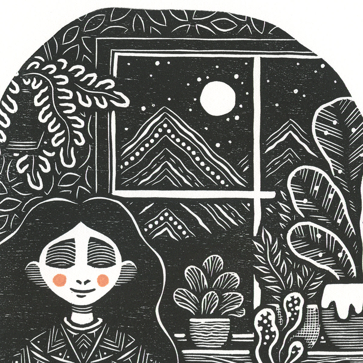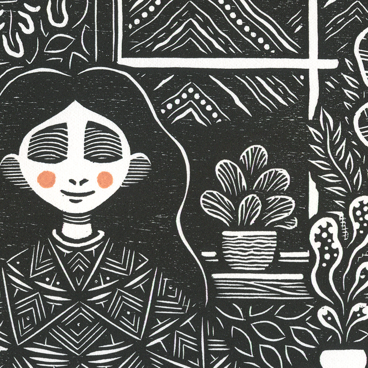 This woodcut is printed with artist quality oil based ink, the soft orange details are painted by hand with acrylic ink.
