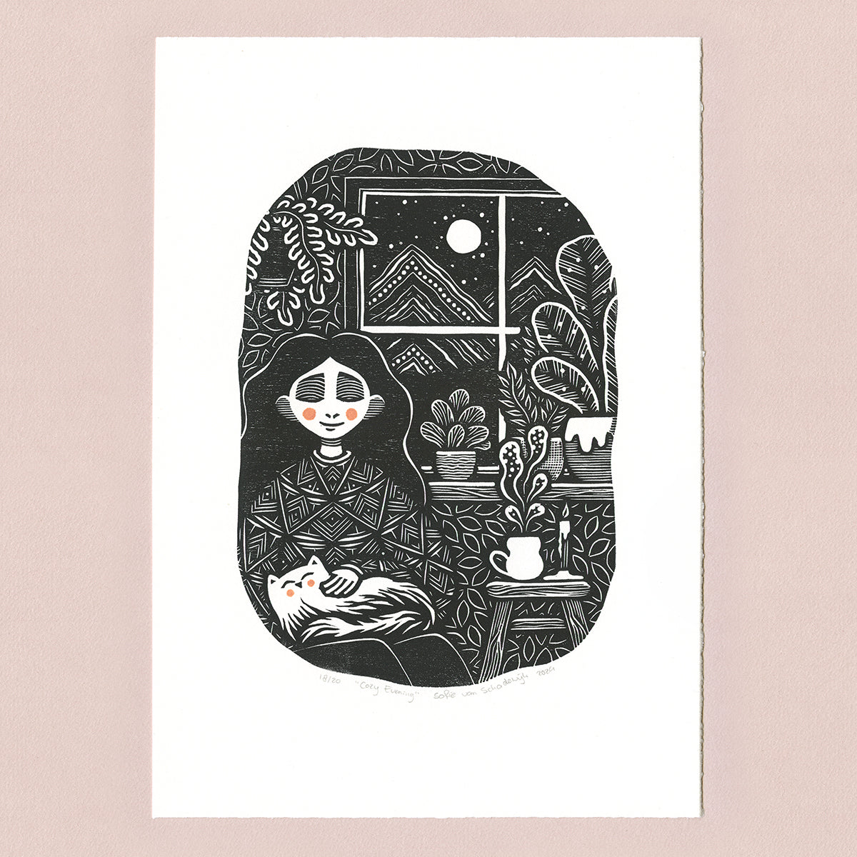 Limited edition of 20 woodcut prints on beautiful white Fabriano Rosaspina paper.