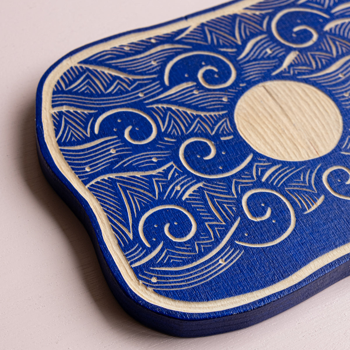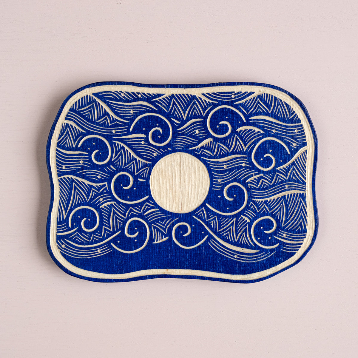 This woodcut is made of 9mm thick Birch plywood. The surface was painted with Ultramarine blue coloured acrylic paint and then carved by hand.