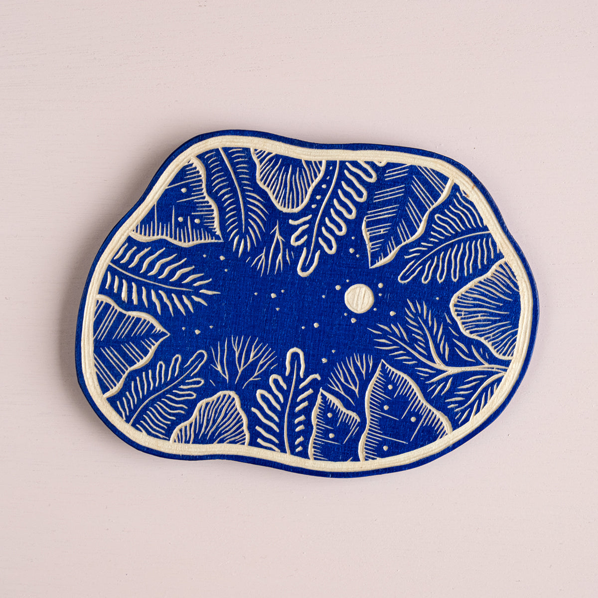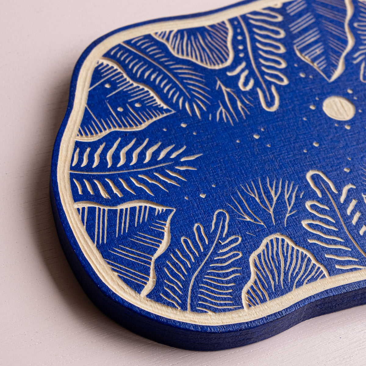 This woodcut is made of 9mm thick Birch plywood. The surface was painted with Ultramarine blue coloured acrylic paint and then carved by hand.