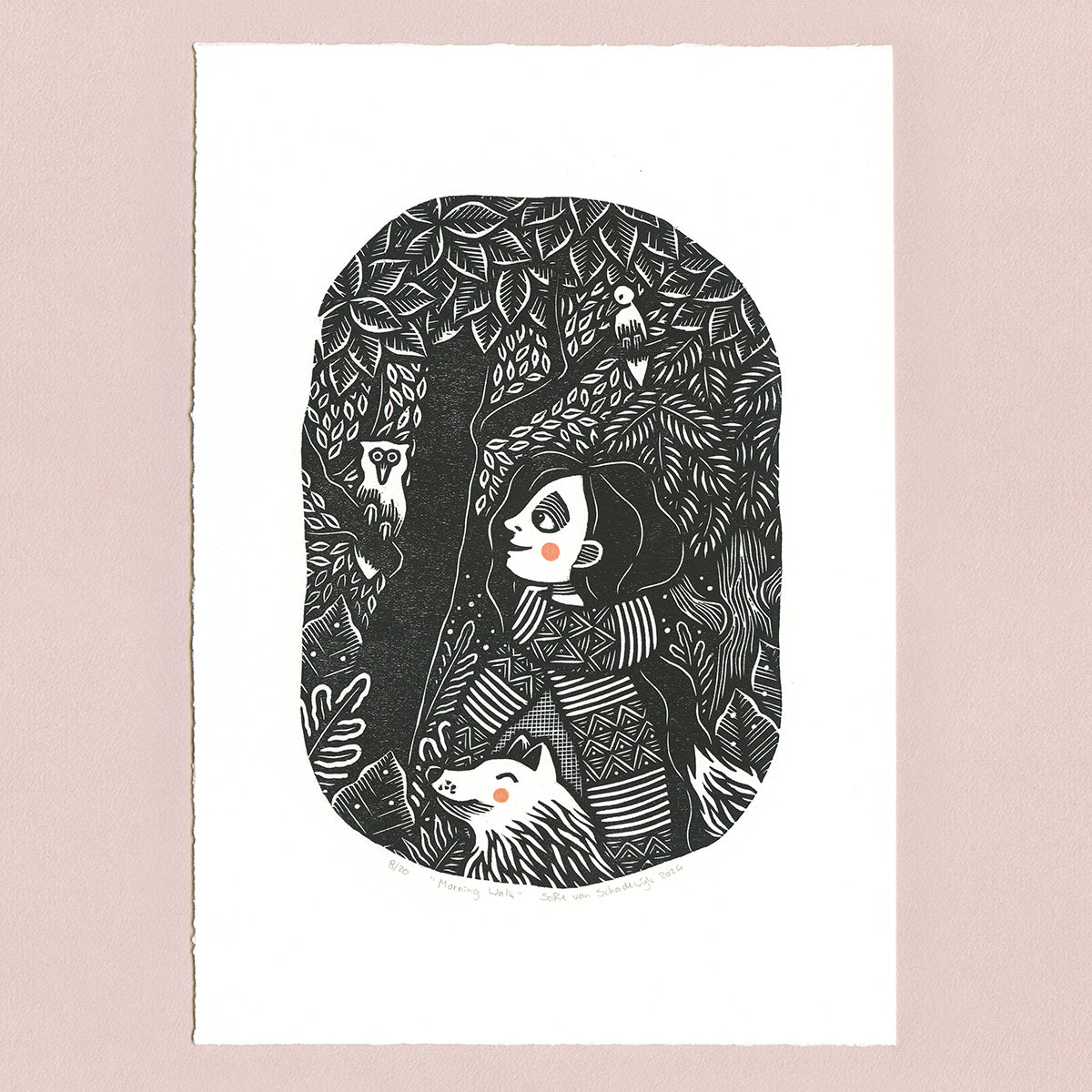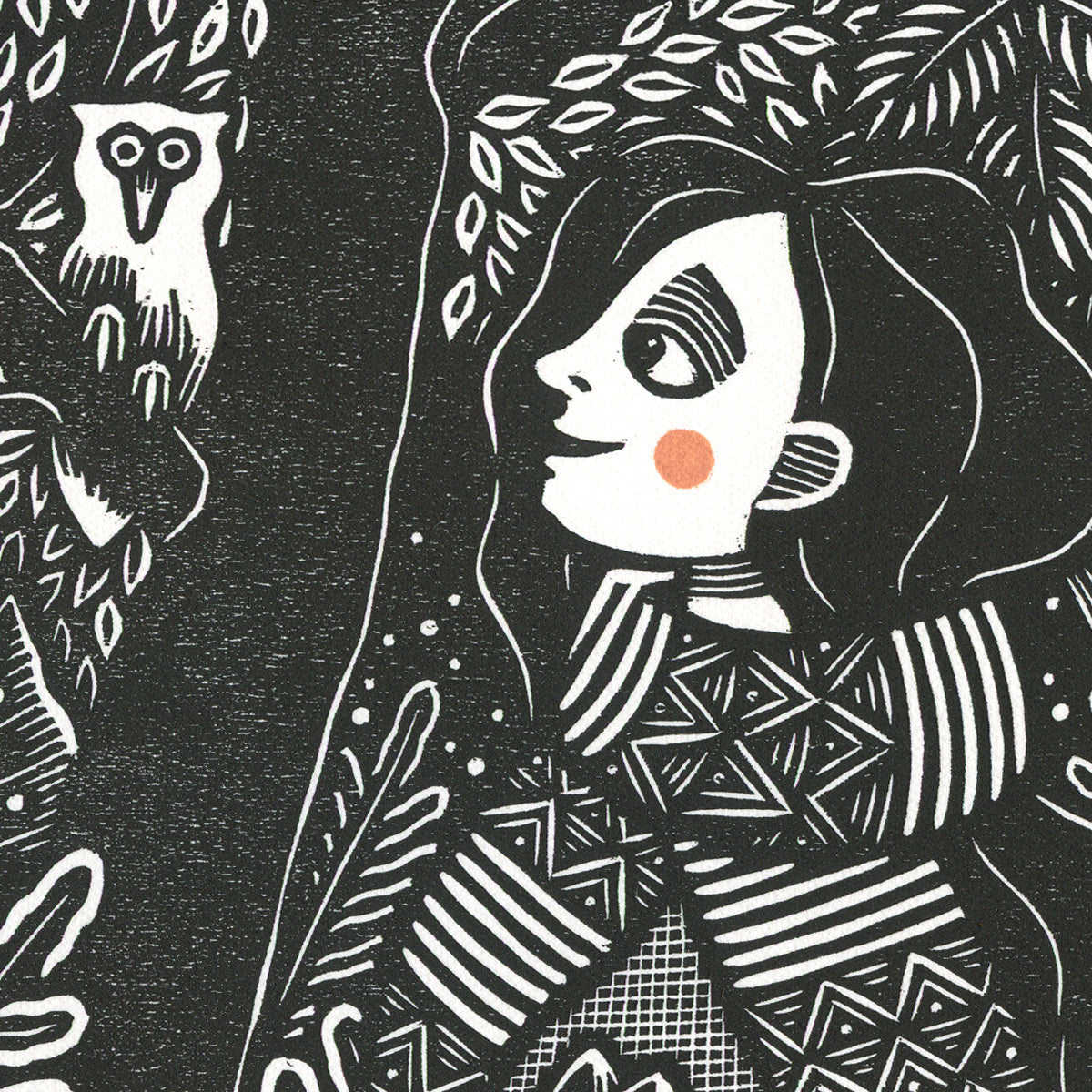 This woodcut is printed with artist quality oil based ink, the soft orange details are painted by hand with acrylic ink.