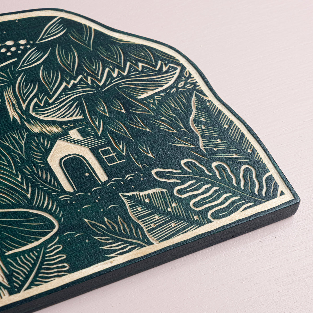This woodcut is made of 9mm thick Birch plywood. The surface was painted with Phtalo green coloured acrylic paint and then carved by hand.