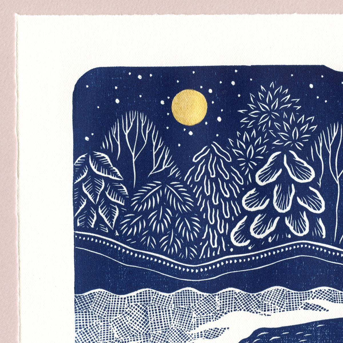 The block is printed with artist quality oil based ink, colour Prussian Blue (a very dark blue). Details are hand painted with gold coloured acrylic ink.